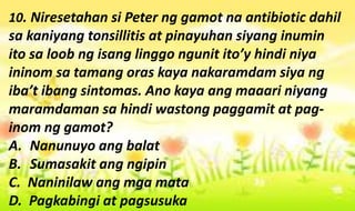 3 Maaaring magdulot ang allergic reactions sa katawan ng tao. Ang paggamit ng mga gadgets ay kalimitang nagreresulta sa adiksyon at pagpupuyat. _____18Tiningnan at sinuri ni Leo ang pakete ng gamot bago ininom para sa kaniyang sakit ng ulo.