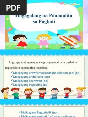 Ang paggamit ng magagalang na salita ay mahalaga sa tatlong kadahilanan. Pagbati Magandang Umaga po. Subukin Piliin mo ang magagalang na pananalita na angkop sa bawat sitwasyon.