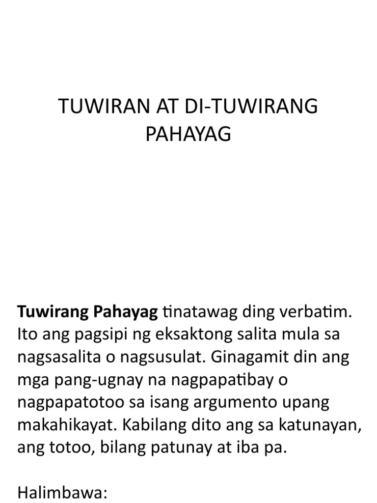 Start studying Tuwiran at di-tuwirang pahayag. Ang Di-Tuwirang pahayag ay binabanggit lamang muli kung ano ang tinuran o sinabi ng isang tao. Isa sa layunin ng sanaysay ay ang lituhin ang mga mambabasa.